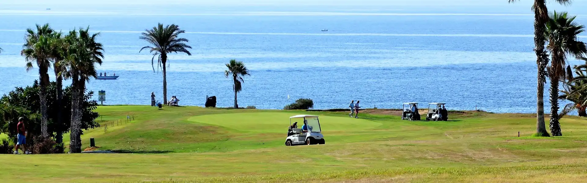 Amarilla Golf is set among residential and holiday accommodation with about half the fairways having villas or apartments running along part of their length. The hole that grips everyone is the short par three fifth; 115 metres off the yellow tees there is no fairway, just the sea to cross and then to land on a small green, it can play anything from a wedge to a five iron depending on wind conditions. This Tenerife golf hole must rank as one of the most spectacular par threes in the world.